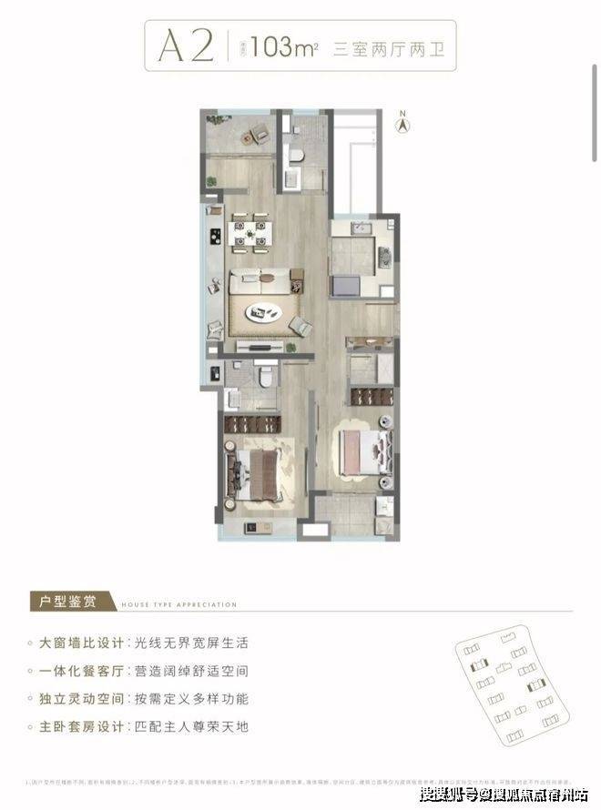 盛青云锦售楼处预约电话:400-8824-198建面约103㎡3房2厅2卫,边套户型,做到了三个面采光+双开间朝南+主卧套房设计+南北通透,室内通透明亮。