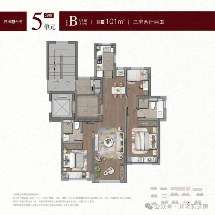 建面约100-101㎡户型, 拥类独立电梯厅,无连廊+飞机户型南北通透。