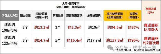 建面约108㎡3房,三阳台面积达约13㎡(赠送一半),飘窗赠送约3.3㎡,室内使用面积达约94.5㎡,实得率高达约87%,总赠送面积比常规次卧都大。