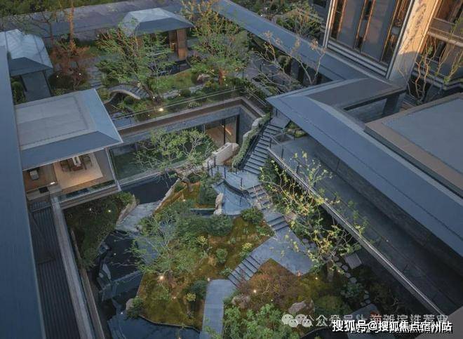再往里走就是近460㎡的下沉式庭院,精选太行山金景石堆叠成小山丘,引进溪水汇聚成池塘,并移栽岭南珍贵的古桩铁冬青和中华原生乌桕树,形成一幅立体山水画卷。