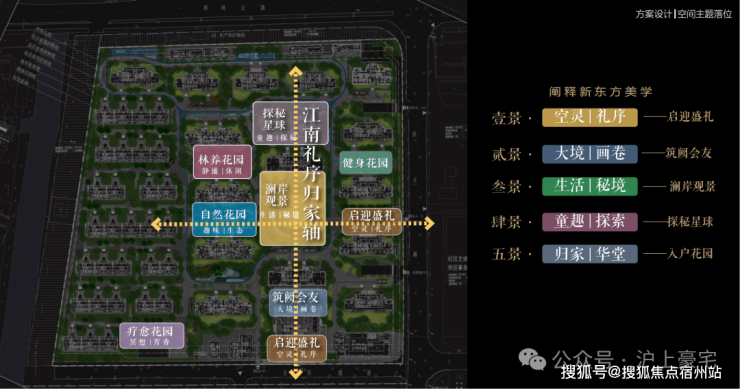 以江南人文精神为源点, 打造两轴一环五进空间,江南礼序归家轴串联启迎盛礼、筑阙会友、归家华堂等5重礼制,尊崇归家;健康运动轴以24小时跑道为社区活力生活环,串联儿童乐园、长者康养、疗愈花园等10大生活场景,营造全龄全时的江南诗意生活