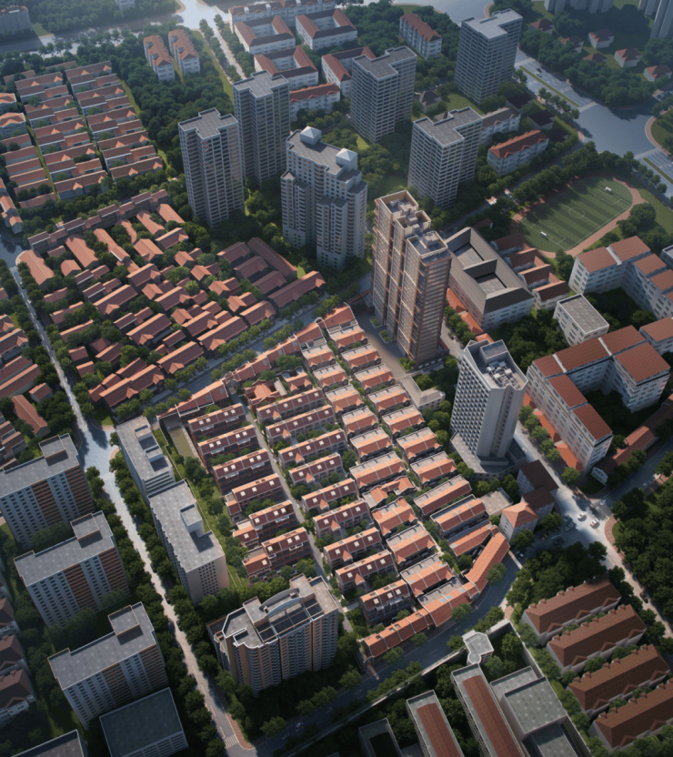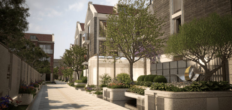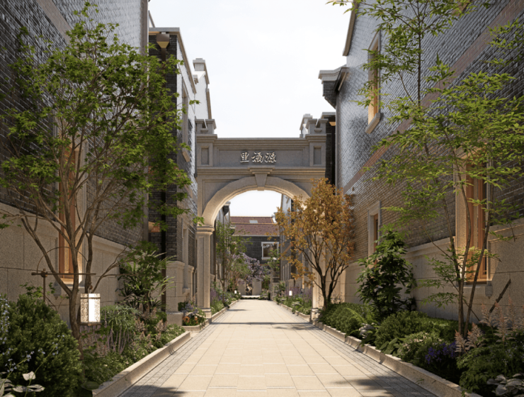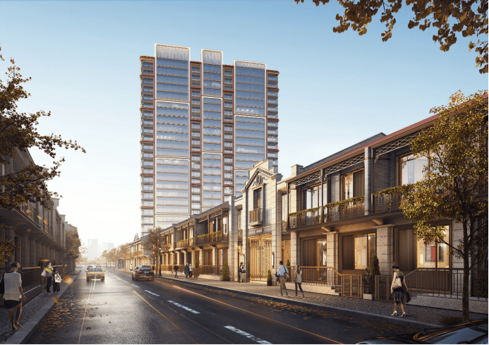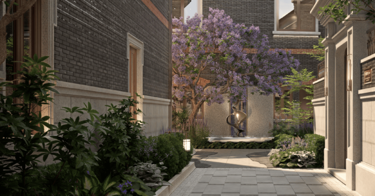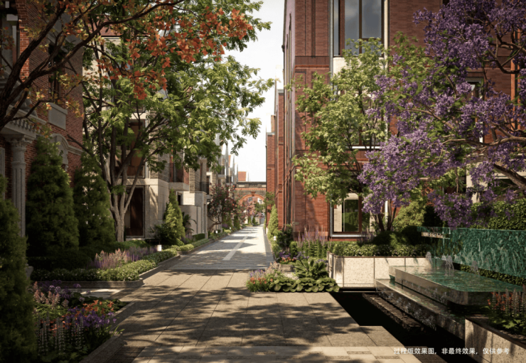 这种对话,首先凝固于建筑的立面语言之中:低密别墅复刻青砖与红砖的肌理,那是与风貌区老房子的无声低语;而高层建筑则选用白玫瑰花岗岩石材、铝板、砖红色釉面陶板,温暖的质感与历久弥新的特性,既是对砖瓦记忆的抽象提炼,也是面向未来的时代新声。 这一切,真正实现了“源自历史,面向未来”的共生理念。