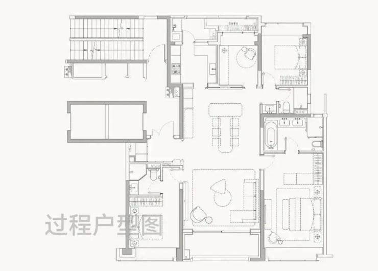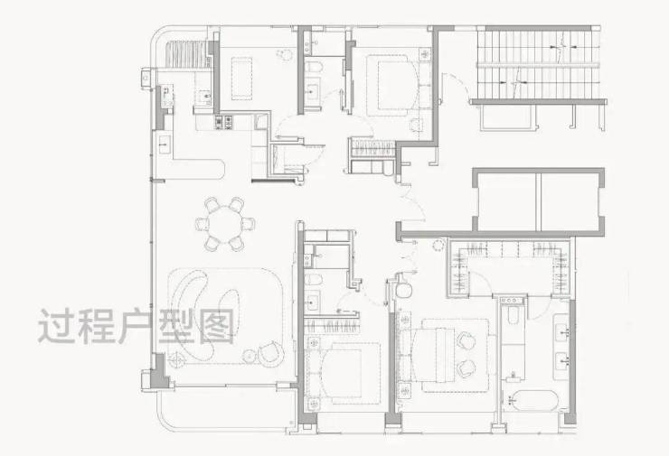 独立私梯入户,配合玄关与储物系统,功能与仪式感兼备。整个格局的智慧,淋漓尽致地体现在南向双套房与北向类套房的分散式布局上,宛如三个自成天地的静区,分布于不同方位,确保家人之间的高度私密,互不干扰——这,才是高品质家庭生活的真正内核。