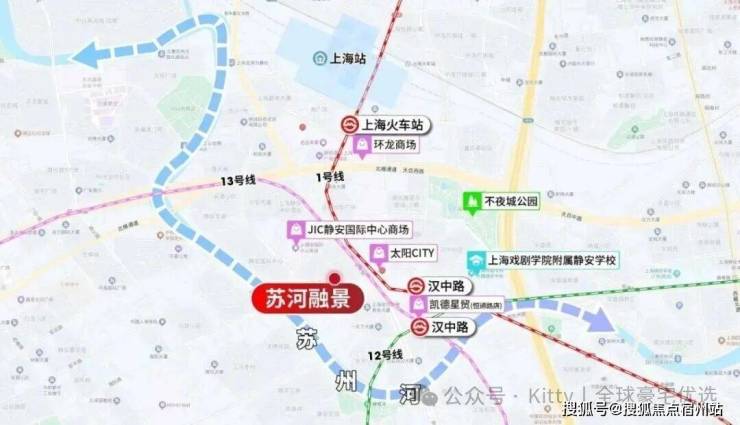 落位到具体交通,苏河融景步行可达(约200米)城心无比重要的十字交错站点——1/12/13号线汉中路站,进站后 2站人民广场,2站南京西路、2站北外滩。