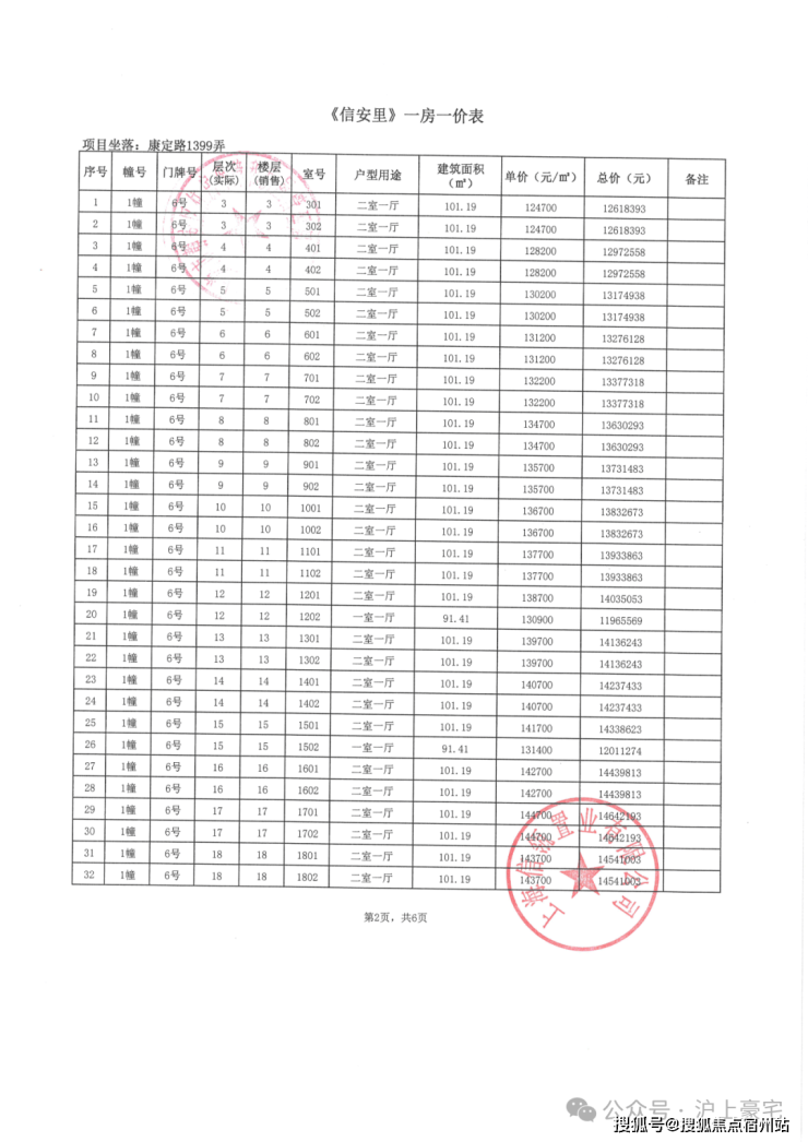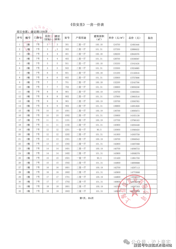 信达·信安里高层/别墅一房一价表如下: