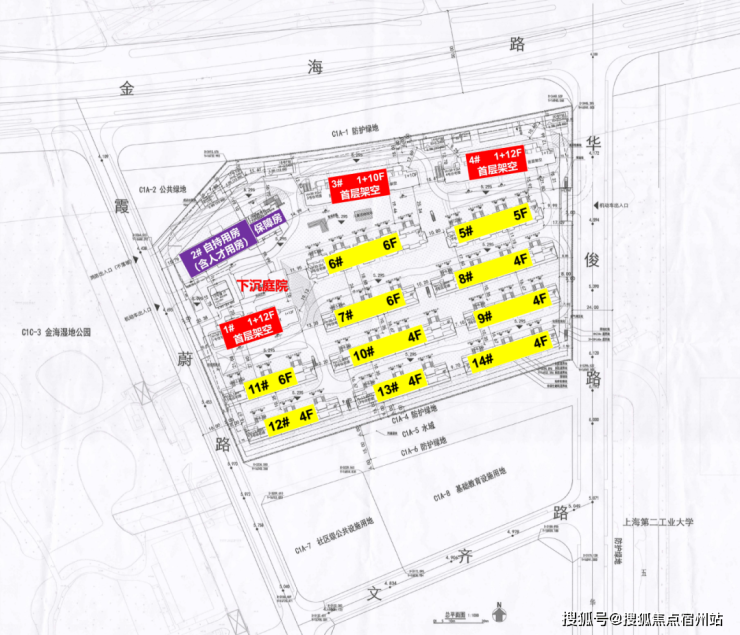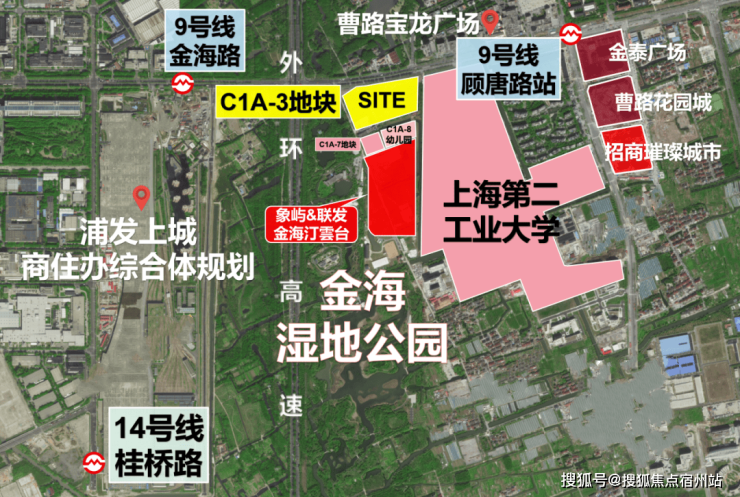 对比来看,新地块优势在于距离地铁站更近,直线距9号线顾唐路站、9号线及12号线金海路站约900米,而且地块面宽更大,户型设计可优化空间多;挑战则是北侧即为金海高架,需投入隔音降噪成本,且涵盖4000㎡商服用地。