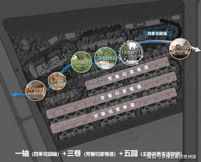 项目以 「一轴-三巷-五园」 为主题,打造约 2.5万㎡尊享园林 ,营造“可漫步,可沉浸,可对话”的自然花园。