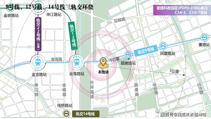 项目是三轨交环绕的真地铁盘,项目距离9/12号线金海路站约800米,另外还有14号线桂桥路站。