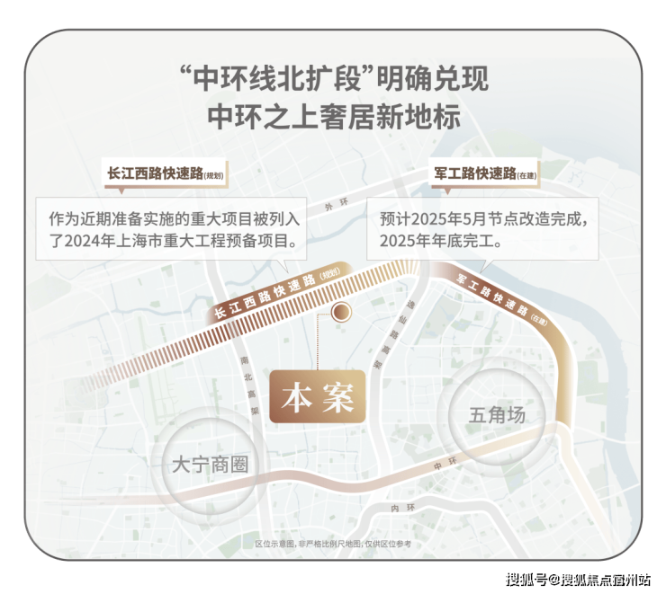 上海招商序售楼处电话:400-88547-06中环线北扩段明确兑现,军工路快速路25年开工,长江西路快速路列入上海市重大工程清单预备项目,快速链通城心,随着中环线北扩段的政策明确,淞南将正式进入中环时间。未来经逸仙高架,进入南北高架、内环高架、中环高架,可快速链通南北上海;