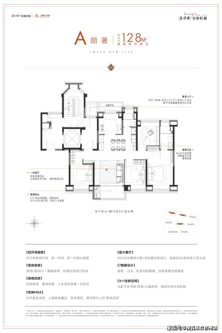 ◎真四开间朝南:2024年上海125-130㎡新房仅约9% 做到真四开间朝南,地铁口4房更少(数据来源网络)。该户型南向总面宽约13米,远超同面积段常见的 10 米面宽,采光视野佳。