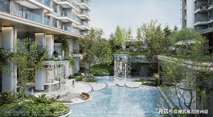 立体叠瀑森屿:项目利用场地自然高差,打造了约10米高的立体叠瀑景观。水流从高处缓缓落下,形成了层次丰富的水景,周边种植了多种名贵树种,形成了垂直绿化系统。