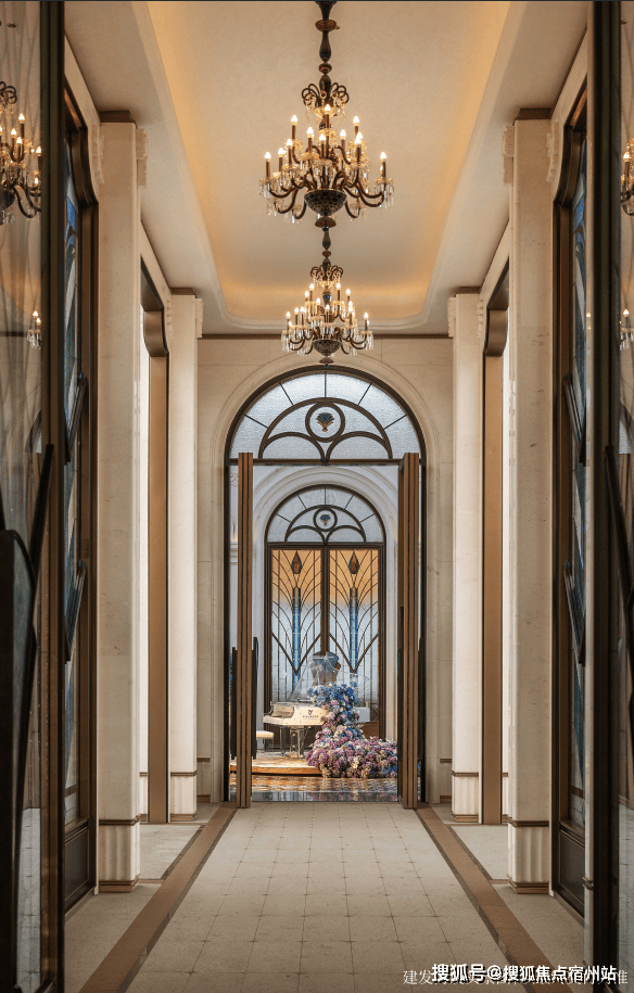 萃取东方色谱精粹,建发·海宸甄选丝箔流金、东方雅铜,青釉奢蓝,以当代笔触晕染立面,令传统色彩在空间生长为永恒的诗意, 「入户门头」 形取和平饭店经典拱门,配以碧绿色天然石材门套、彩玻花窗,重现百年外滩门廊的尊崇仪式。