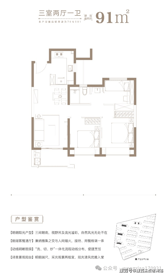 建面约91㎡3房2厅1卫户型,做到了三开间朝南+双朝南卧室带飘窗+动静分离+卫生间干湿分离,采光面拉到极致的小3房户型。