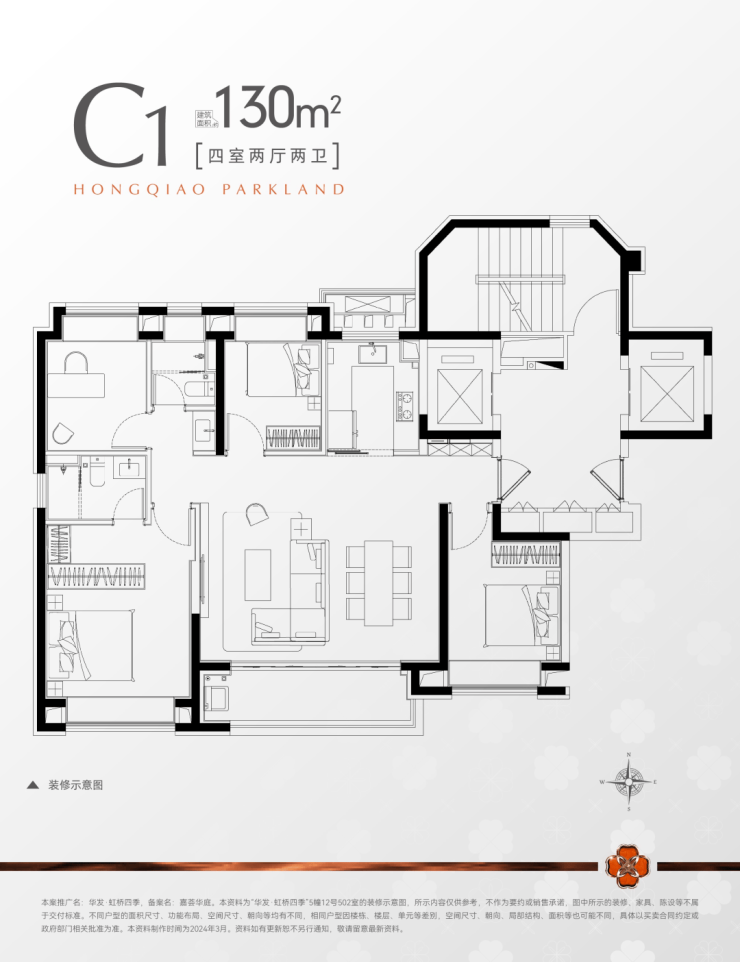 建面约130㎡4房2厅2卫▼
