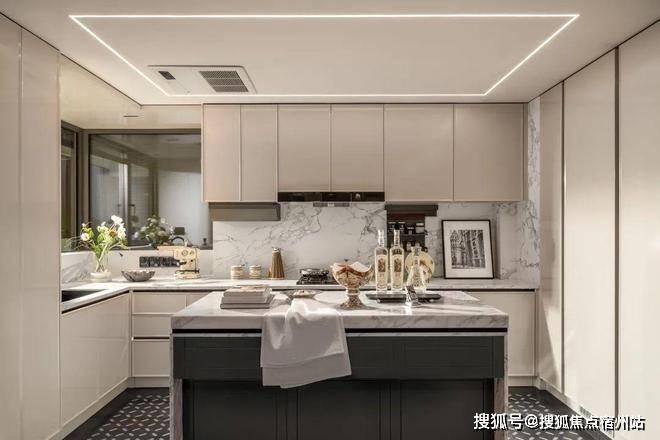厨房更是拥有别墅级大空间,通铺中央空调、地段,甚至还有交付的奢石大岛台。