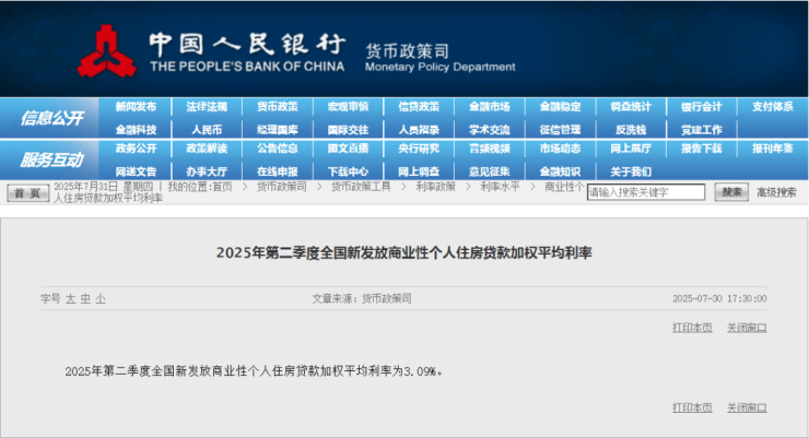 因为2025年第二季度全国新发放商业性个人住房贷款加权平均利率为3.09%。
