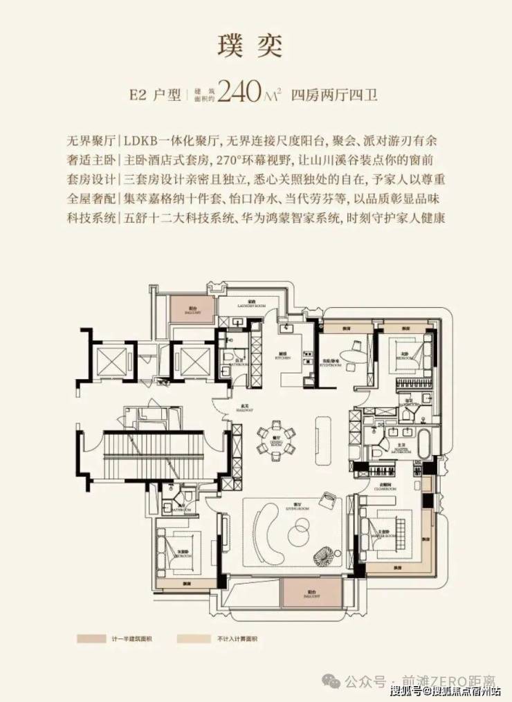 建面约240㎡户型是经典南北通结构, 客餐厨总面积超90㎡ ;