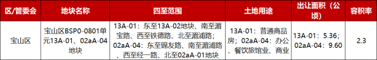 地块地处宝山杨行,是19号线宝山站(在建)TOD综合体地块。地块用途为商业、住宅、办公、餐饮旅馆混合,其中13A-01出让面积149538.36平方米,容积率2.3,楼板价9058元/㎡,装修标准2500元/㎡。