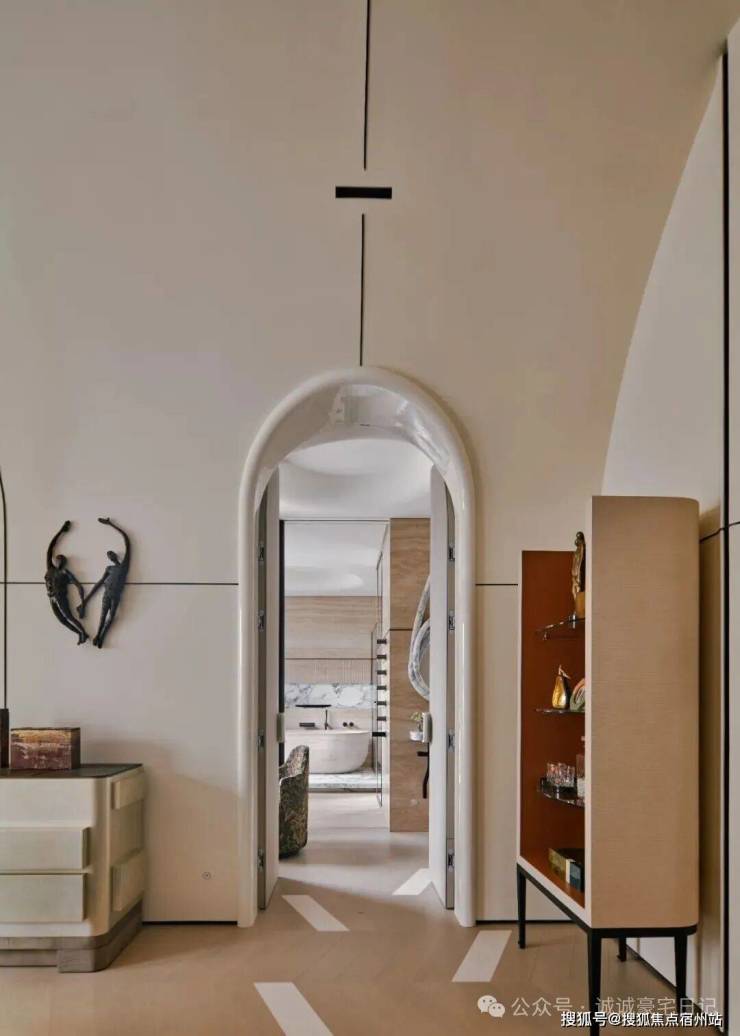 顶层专属于主卧,推开双开门,拱形天花设计尽显浪漫,挑高至3.8米,一条长灯带自浴室贯穿至整个卧房,分置于灯带两侧的弧形结构,环抱出一份安心。而其床头背板也被设计成拥抱的视效,为空间增添温暖包裹的氛围。