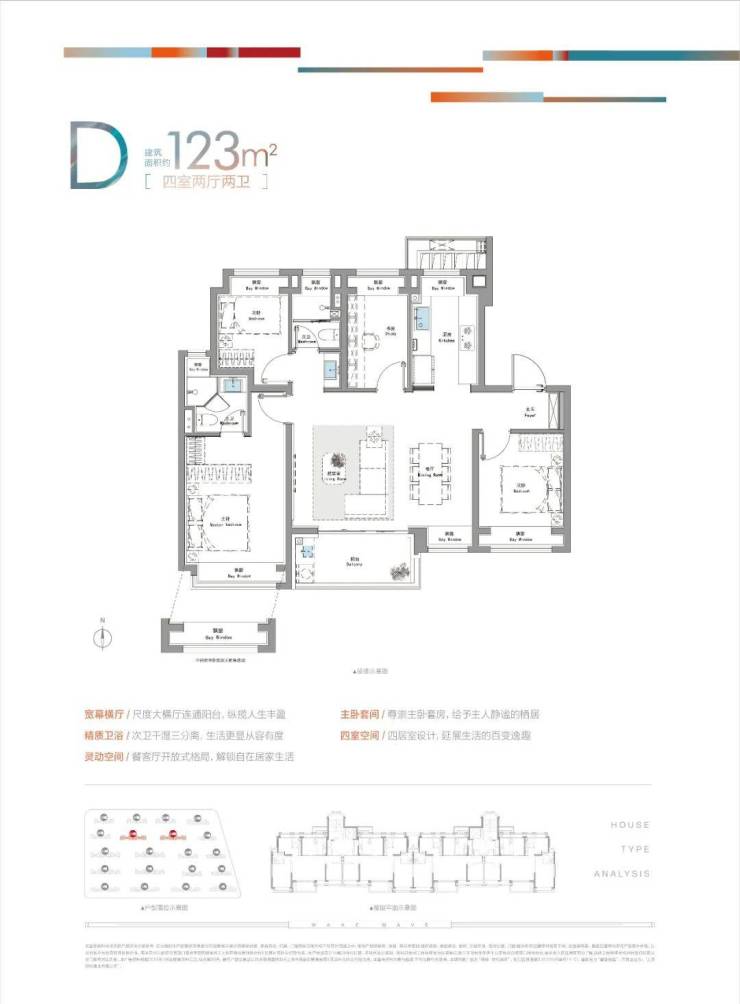 建面约123㎡4房四开间朝南搭配一个巨幕横厅。