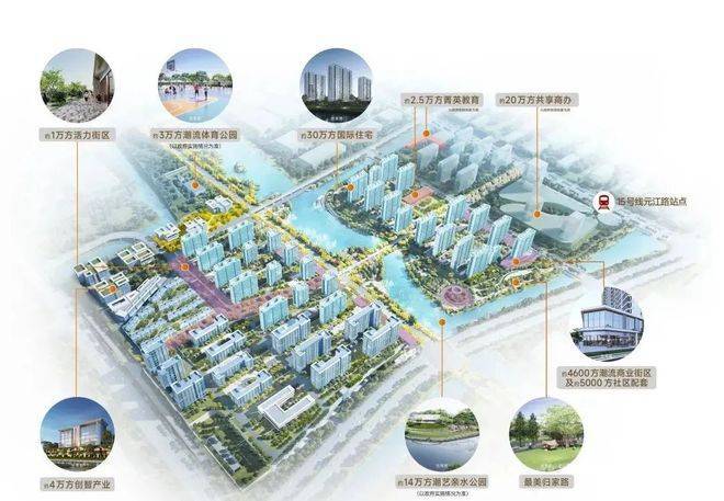 该项目在社区中整合公园与天然水系,通过约3万方的运动竞技公园与约14万方的滨水艺术潮流公园及城市绿地,共同组成约20万方的滨水双公园体系,从而构建出自然生态背景下的超级TOD基础。