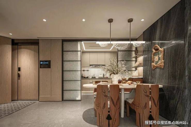采用米黄色温润石材,巧妙模拟风的流畅形态,营造出既庄重又舒适的归家氛围。这片宽广的流线型石墙在柔和灯光的映衬下,更显璀璨夺目,而风雨连廊的灯带设计,更添一份尊贵仪式感。