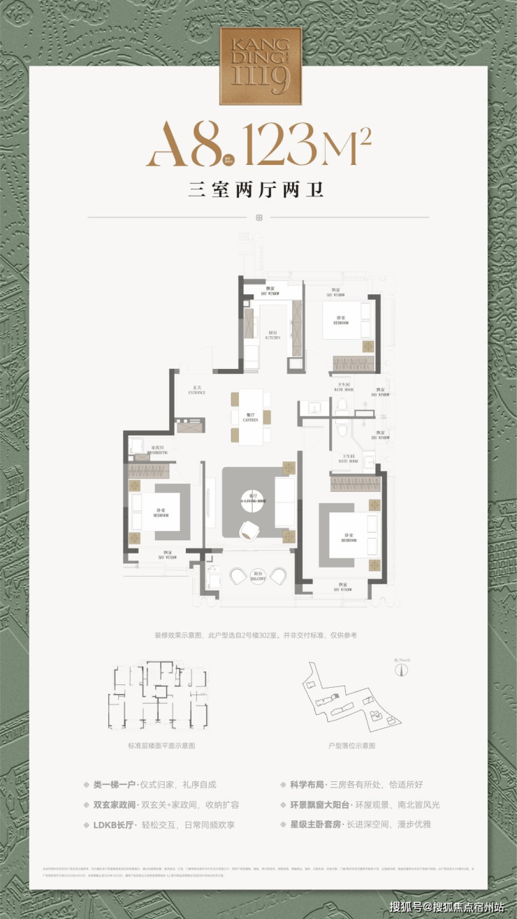 建筑面积约123㎡三房户型,飞机式布局,一镜到底的LDKB长厅,尽显隐贵静安风范;