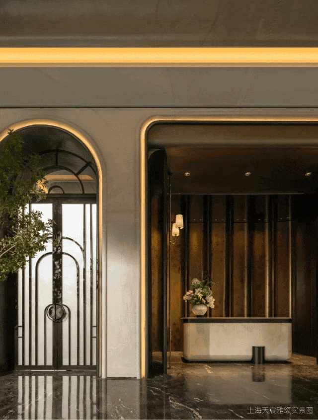 门厅 , 作为建筑空间的第一重呼吸,在摩登且包容的主基调上,汲取 西方古典园林的轴线秩序感, 同时在细节处融入了东方留白的智慧,并以黄金比例分割的线条韵律与考究材质的肌理对话,让这个过渡空间成为兼具当代美学精神与人文温度的仪式场域,让居者于此处完成从外部世界到内心居所的优雅转译。