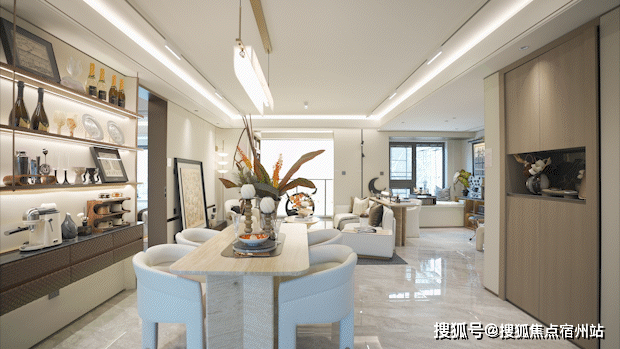 全墙纸交标结合整幅岩板客厅景墙,以定制设计感提升空间立体感。