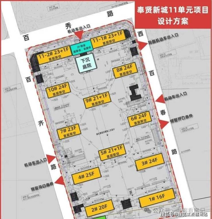 5-11#均做了首层架空;楼间距特别宽阔,最大约70米,最小也有43米,大栋距也方便打造中心景观(景观方案待深化);地块西南角,开发商会代建约1000㎡绿化,24小时开放;北侧百秀路出入口处地面上是配套用房,连接下沉庭院;东侧百春路上也有一个配套用房,设计了景观廊架,会是未来的人行主入口。