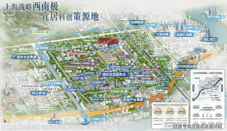 该项目落子松江新城国际生态商务区,是西派系4.0上海迭代之作,距松江枢纽约3公里,周边有G60科创走廊产业与上外云间学校等资源。