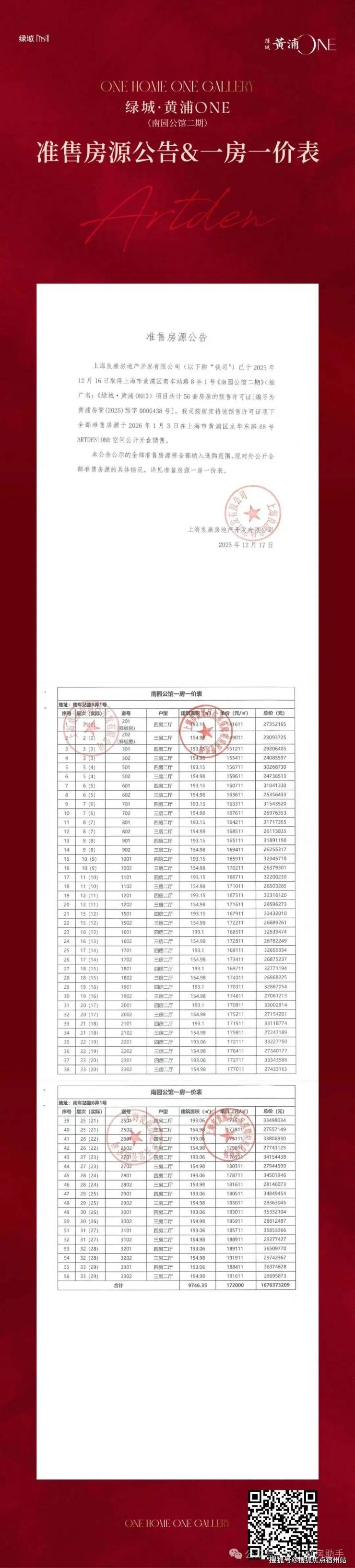 绿城黄浦ONE项目一房一价表: