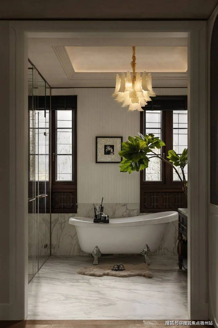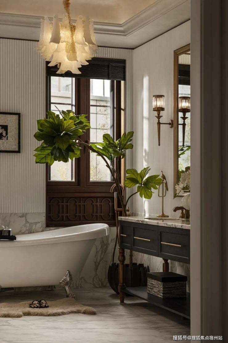 在热带植物的衬托下,浴室多了一抹明媚的自然气息,螺钿艺术画在光影中散发着斑斓的色彩,奢华无需多余的赘述。
