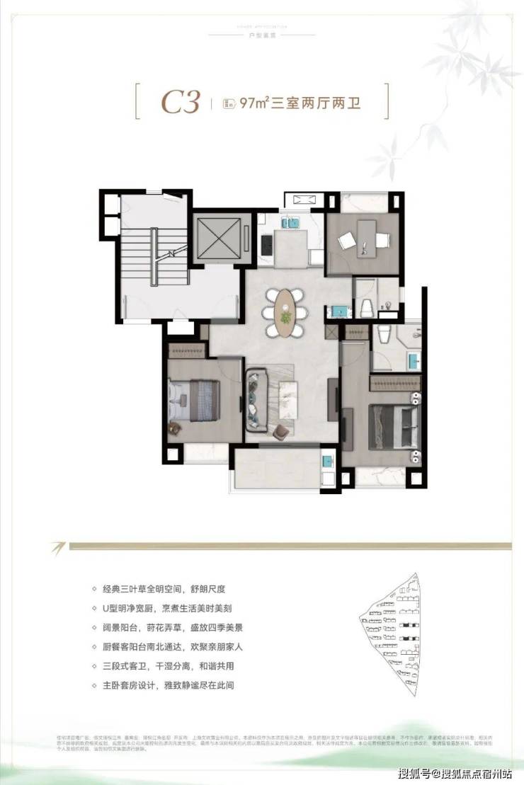 户型三开间朝南、室内3个飘窗+1阳台+主卧套房+“2卫”的设计,不管是采光、视野、通风、私密性,还是实用性都十分出色。