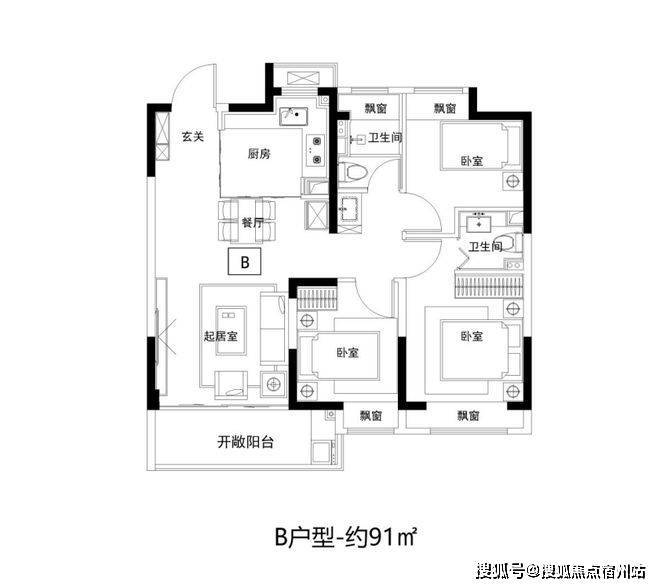 建面约91㎡3房2卫,三开间朝南,客餐厅连通大阳台, 四飘窗设计,好户型该有的素质它都有。