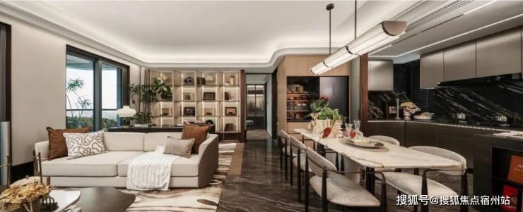 吊顶采用 一体化大平顶加回型吊顶 设计,并且在四个角均匀做了 圆弧处理 ,让整个空间感更加和谐圆润。