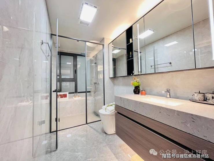 在细节上同样不遗余力。比如入户后的玄关柜是交付标准,打开厨房柜体、镜柜等各类收纳空间时均有惊喜;再如客厅和主卧均采用弧形吊顶,还有风暖浴霸、玄关顶面感应灯等细节,都透露出项目对品质生活的追求。