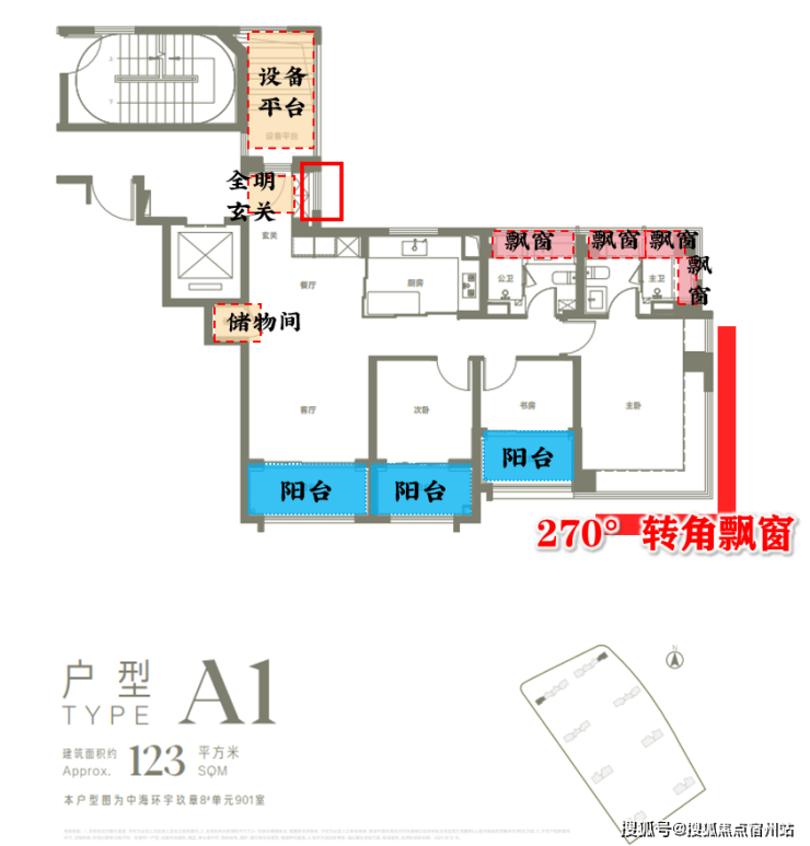 同时户型还做到了全系多阳台设计+高实得率!以主力建面约123㎡3房为例: