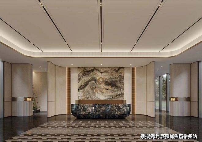 招商时代潮派售楼处预约电话:400-8824-198顶部采用香槟金色的斜角造型铝板,搭配手工打磨的星空顶及氛围灯,地面铺设仿石砖,墙面基调则借鉴了华尔道夫酒店的浅米黄色系大理石,并配以精致的礼仪灯设计。