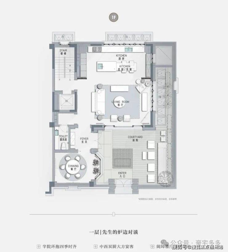 一楼为整体餐客厨空间,整体面宽超过13米,客厅南向正对别墅庭院,整体室内采光充足: