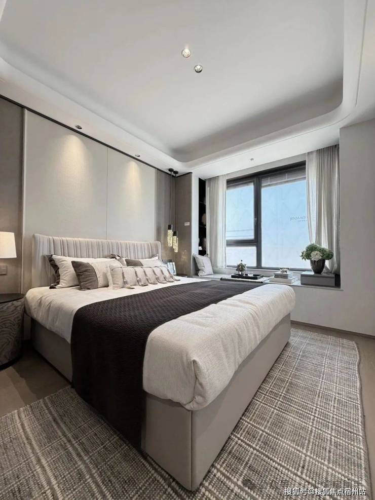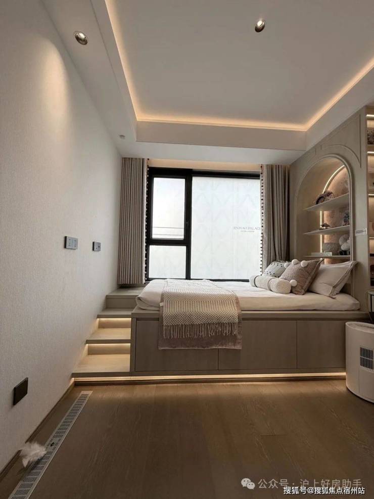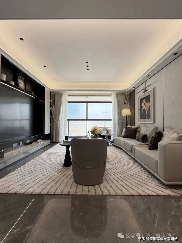 悬浮式弧形吊顶像给天花板开了美颜滤镜,配合无主灯设计,光线柔和分布,给予视觉与心理的舒适体验。