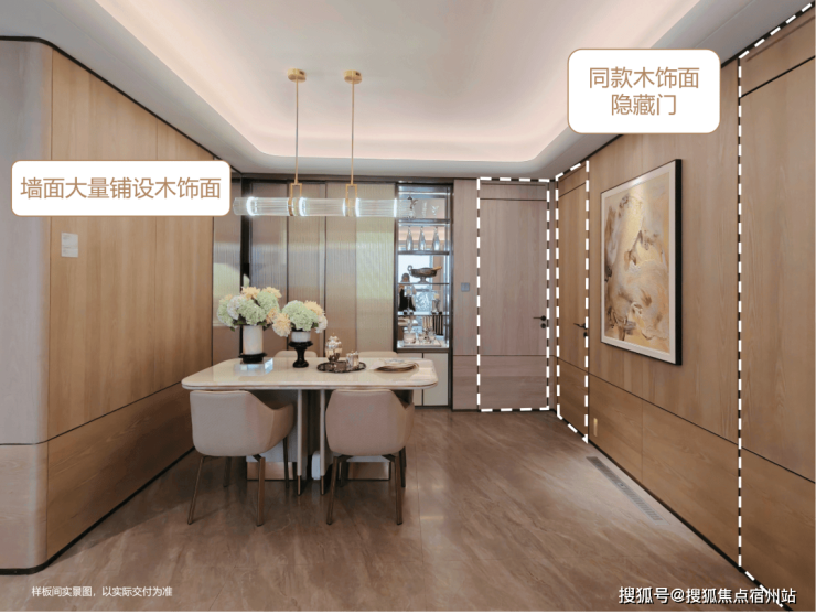站在客厅可以看到,墙面大量铺设木饰面,巧妙 “收起” 线条,自然的木质纹理营造出舒适氛围。
