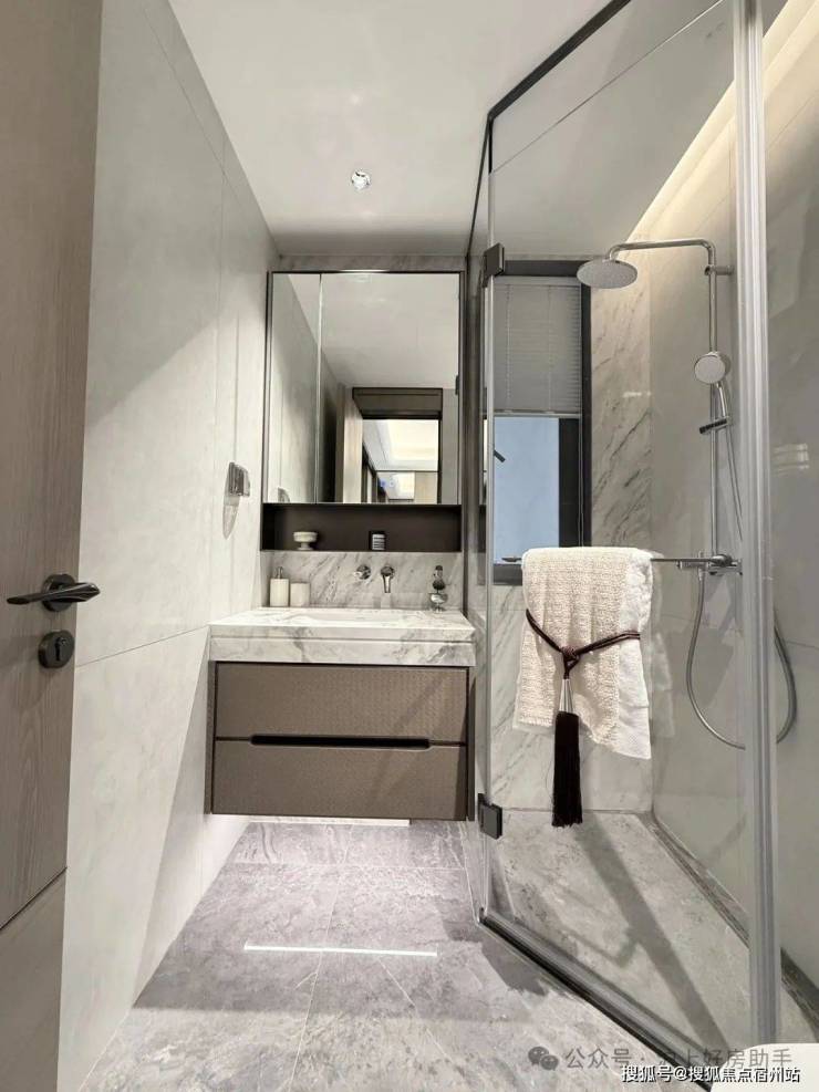 入户玄关,采用皇家白玉的台面,玄关柜的上部门体采用全屏BV式的皮革包裹,有质感有审美。