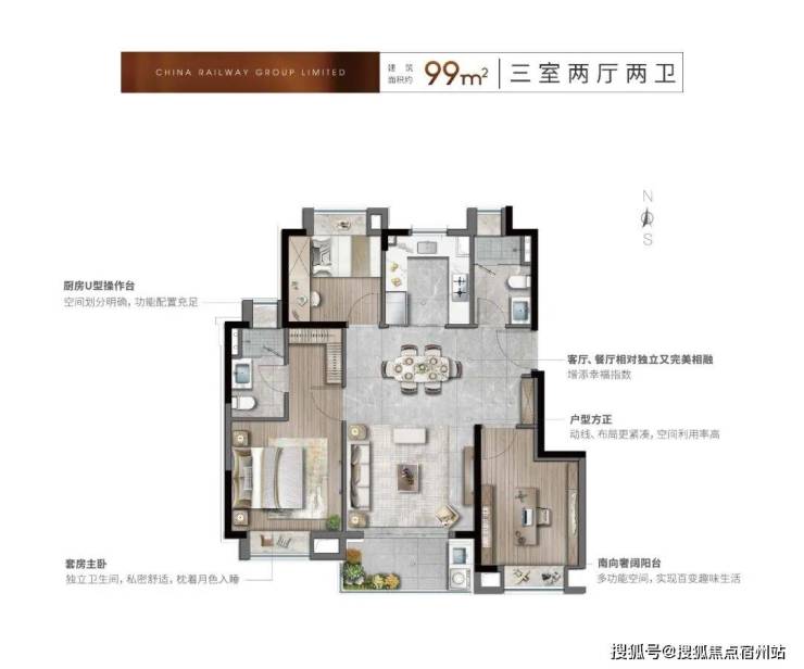 99㎡高层户型,是“舒适进阶”的主流选择。LDKB一体化设计打破空间界限,南向主卧套房兼顾私密与尊崇。U型厨房和干湿分离卫生间等细节,尽显生活场景营造的巧思。