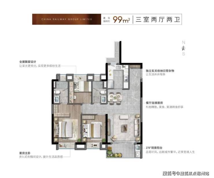 99㎡洋房飞机户型,为改善家庭量身打造。更低密度带来更优的采光、通风和静谧性。南向三开间布局搭配主卧套房步入式衣帽间,约79%的高得房率,在可控面积内实现居住品质的显著跃升。