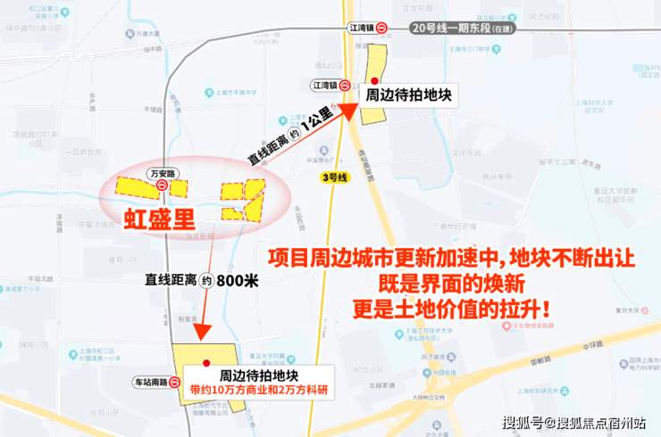 三轨交环绕形成高效通勤网——直线距离3号线江湾镇站约500米,3站虹口足球场/7站人民广场/8站南京西路/9站静安寺;直线距离20号线万安路站约150米(在建)/直线距离南北大动脉19号线车站南路站约900米(在建),未来可直达北外滩、陆家嘴。