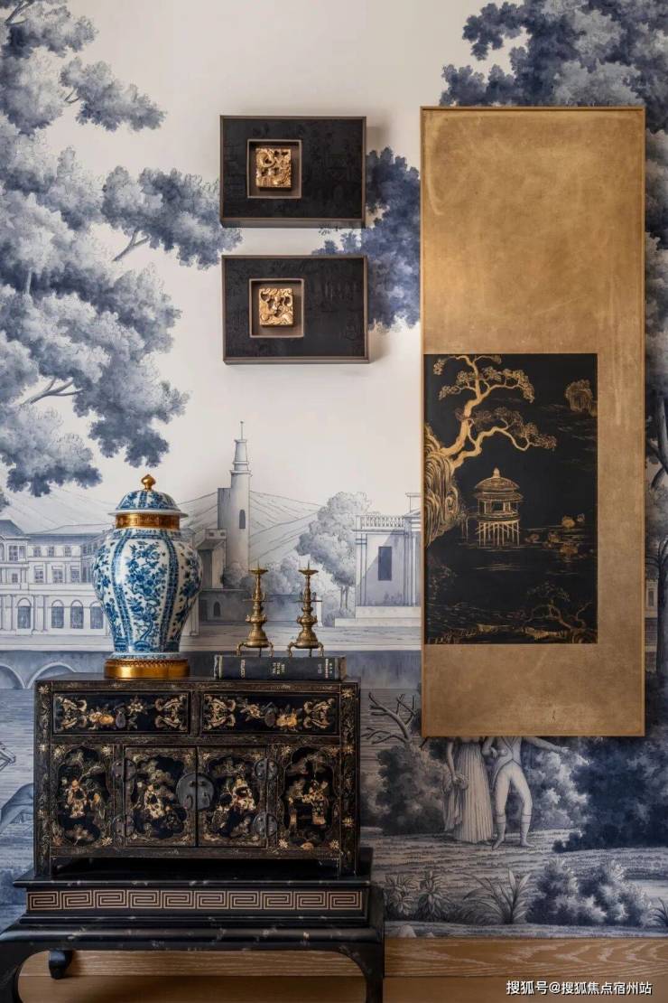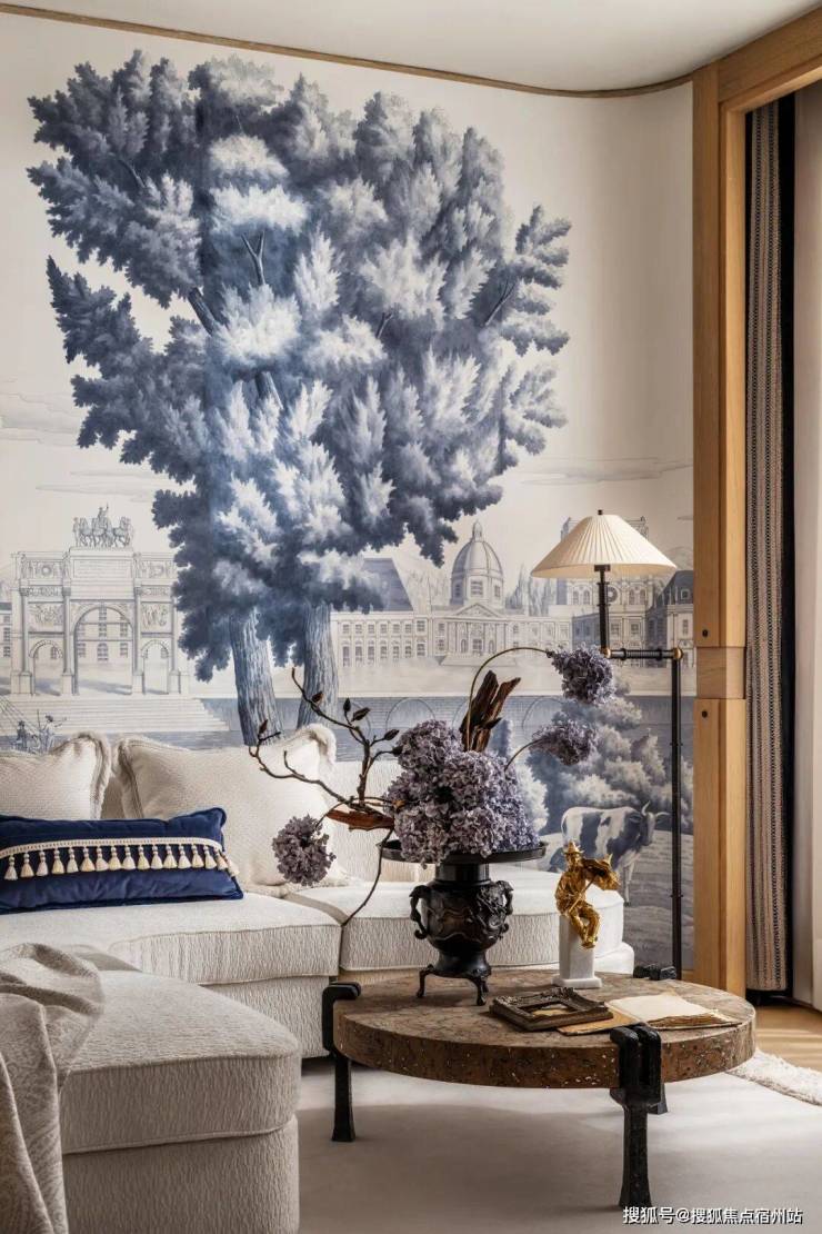 ▎用于休憩的小厅被蓝白色的法式绘画装点,打破三维于二维空间的界限,透过中古中式斗柜和青瓷、金箔绘画进入墙内。织布白色短绒L形沙发与圆形茶几像榫合,在工整的绘画世界开辟出一隅几何景致。