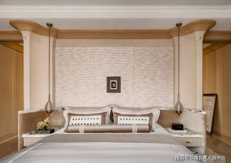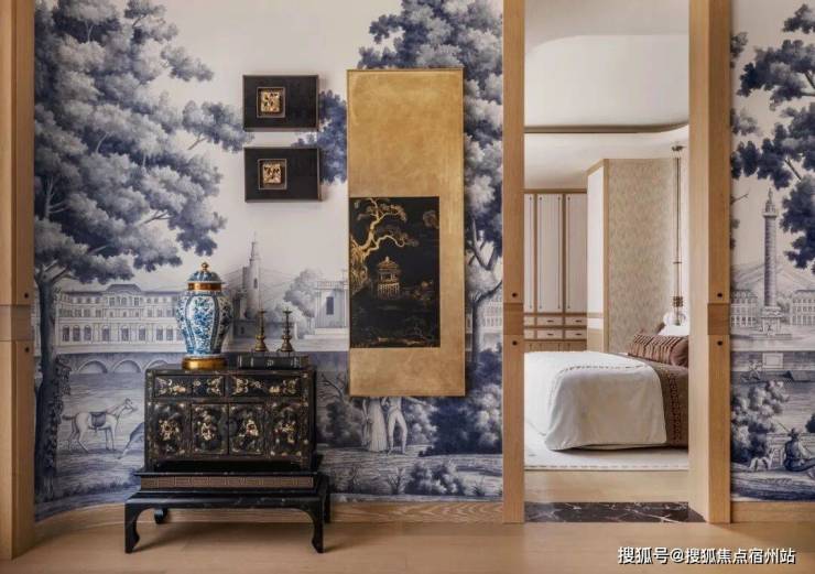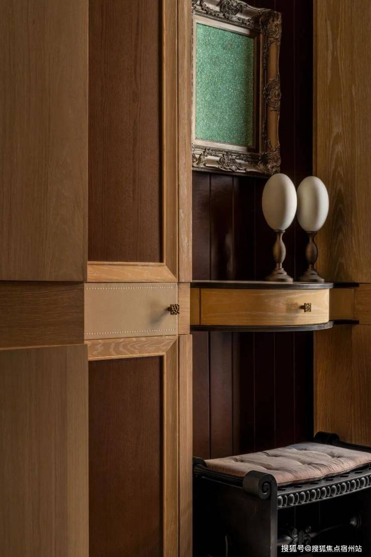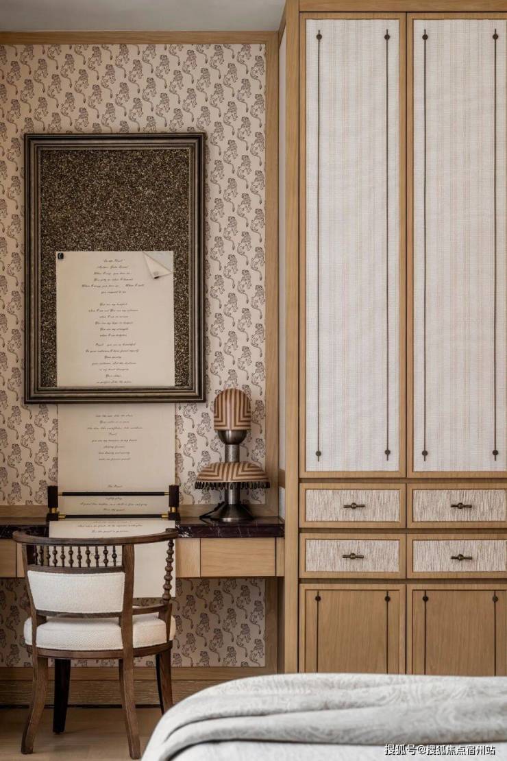 ▎次卧大胆地在装饰层面上引入春天,仿佛走入玛格丽特的油画,在后现代艺术思潮的影响下,将更多对复古和装饰主义的理解,犹如彩蛋埋藏于软装家具中。三层的书房、衣帽间等空间,更好的体现了复古、折衷主义审美的优势,将更多法式元素融入其中,中和了过多中古元素造成的肃穆,让换衣、阅读、办公的过程能够在一个相对纯粹的空间进行。艺术家赵玖的《天青》在空间中不仅仅是墙上的画,而是墙在竭力禁锢一片即将爆发的天空。