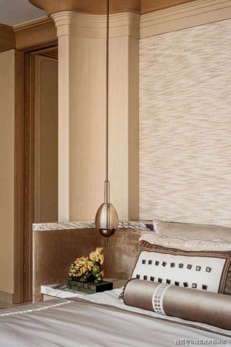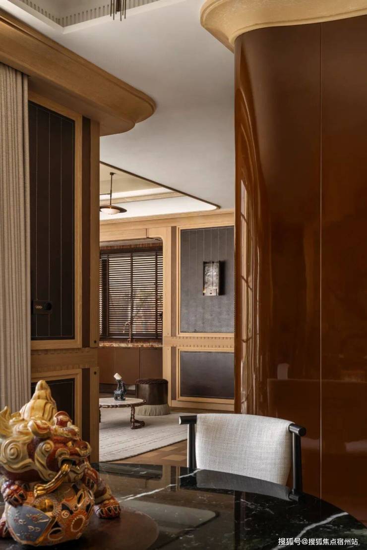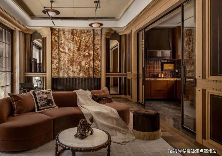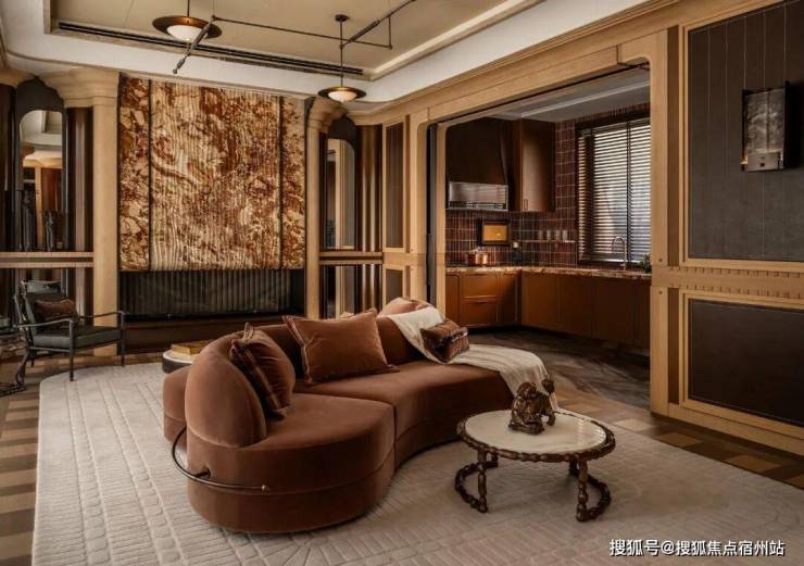 ▎诞生于繁华之下的装饰艺术空间,以弧形组合沙发为中心,彻底告别现代设计惯性下的刻板布局,让沟通和互动成为该区域的核心。茶几与单椅的材质多样,如代表黄金比例的螺旋曲线,将空间中材质组合的完美搭配由宏观的立面和平面引至微观的织物与镶嵌。餐厅延续经典装饰艺术美学,以深绿色奢石餐桌、珠光椅面与手工金属吊灯营造低调而华丽的用餐氛围。