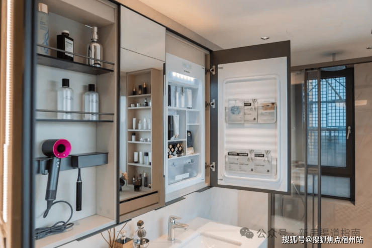 卫生间的镜柜设计,内设 三宫格镜柜 收纳:左侧是日常洗漱用品,中间作为护肤常备收纳,右侧是美妆冰箱收纳。